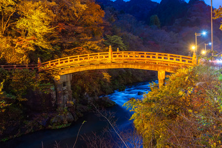 Famous Shinkyo bridge in autumn at night, Nikko, Japan