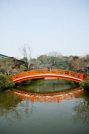 A bridge over a Japanese lake.