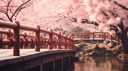 The bridge Around with Beautiful cherry blossoms. sakura flowers in japan.
