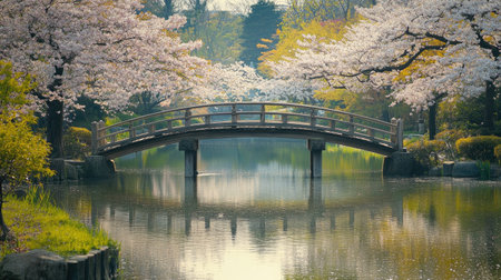 A serene landscape of pink cherry blossoms blooming over a wooden bridge in a Japanese garden. The water reflects the trees and flowers creating a picturesque scene.