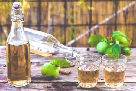 Cider. person pouring green apple cider. glass and bottle are filled with golden apples cider on outdoor table with green color theme and green background.