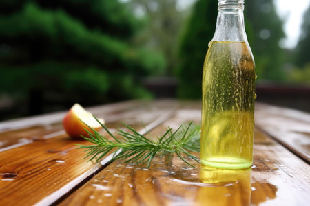cold cider bottle sweating on a pine table, created with generative ai