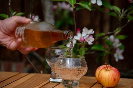 Pouring of french apple cider in glass made from new harvest apples outdoor in sunny orchard