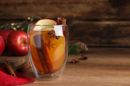 Hot mulled cider on wooden table, space for text
