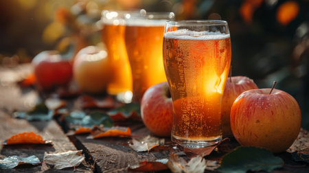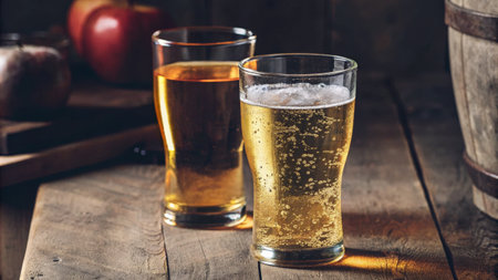 Two Glasses of Chilled Cider or Beer on Rustic Wooden Table
