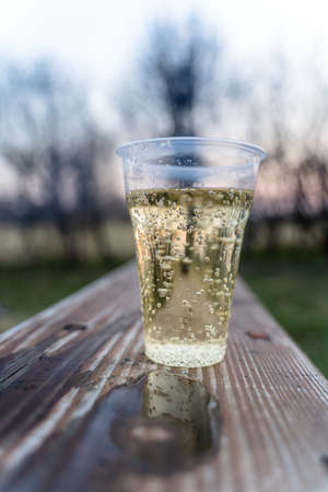Sparkling Champagne in Plastic Cup, Concept of Alcoholism and Loneliness