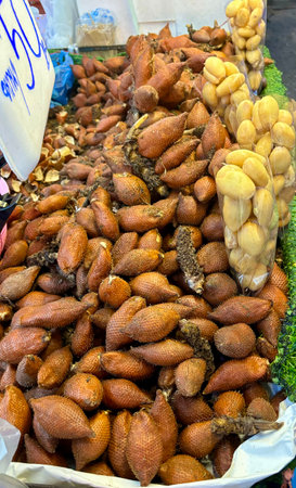 Sala or Salacca zalacca, sweet and sour tropical fruit in fruit stall, Thailand