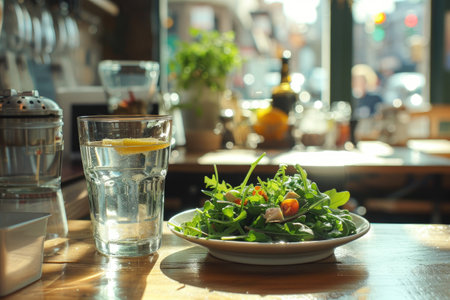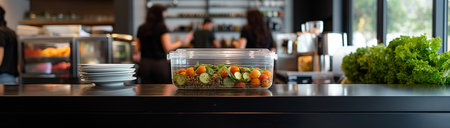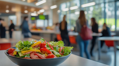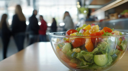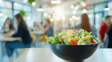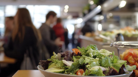 Fresh salad on a table in a lively cafeteria, with the blurred figures of people in the background, creating a dynamic yet healthy scene.