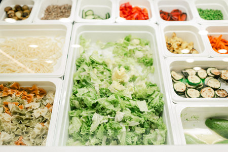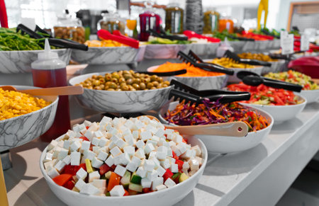 Colorful Salad Bar Selection Mediterranean, Caesar, Greek. Healthy Vegan Lunch Assortment