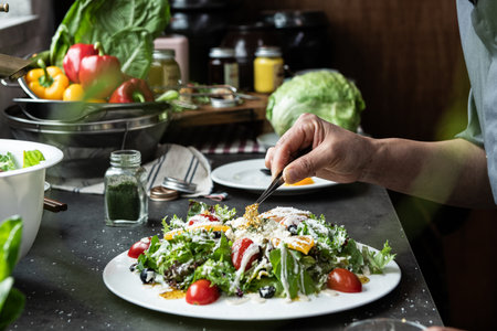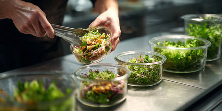 Chef prepares fresh salads in a kitchen during afternoon service for local restaurant