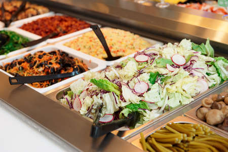 Showcase with salads in the dining room or cafeteria. Image for Cafe and Restaurant Menus
