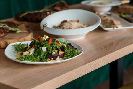 A delicious salad with greens on the table in the cafe. Salad on a white plate