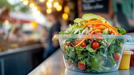 Fresh organic salad with greens and vegetables in bowl, grab-and-go snack, ready-to-eat, photographed at outdoor market food truck.