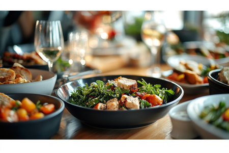 Delicious chicken salad served on a table with other dishes and wine glasses, creating a vibrant dining atmosphere