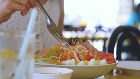 POV, male hand eating fresh salad in restaurant, strawberry on a fork