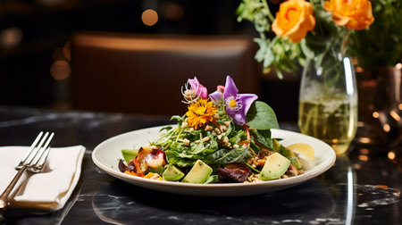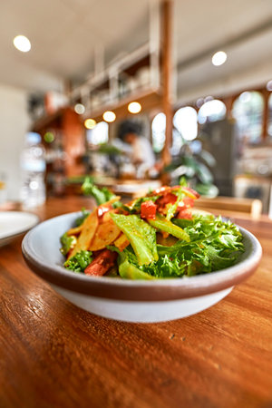 Colorful fresh salad with a mix of vegetables and fruits at a cozy dining setting in a restaurant