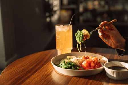 Fresh salad with avocado, cucumbers, and sunflower seeds served in a trendy cafe during lunchtime