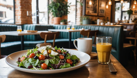 A vibrant and fresh vegetable salad is served in a spacious cafe, paired with a coffee and dressing. The colorful ingredients invite a healthy dining experience.