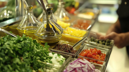 Vibrant Salad Bar Display with Fresh Vegetables, Greens, and Delicious Dressings for Healthy Eating