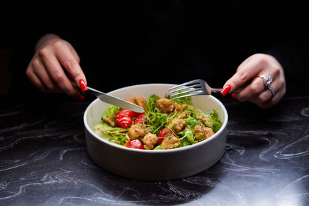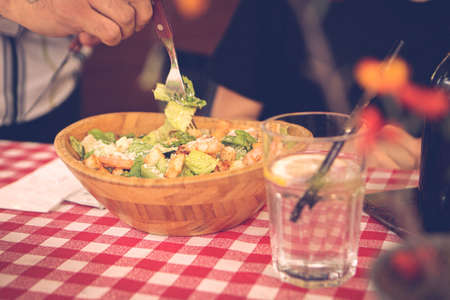 Eating tuna and lettuce Nicoise salad at the restaurant, haute cuisine
