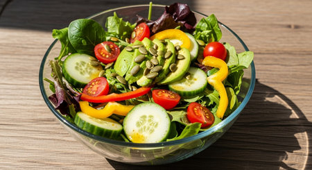 Healthy salad with fresh vegetables and pumpkin seeds on a wooden table