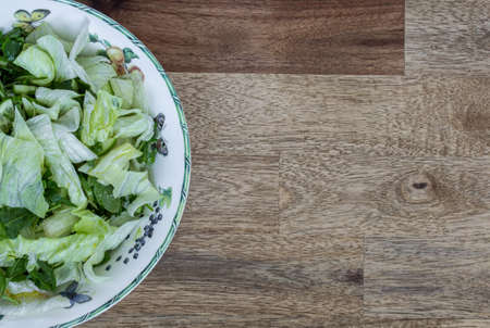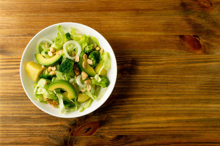 Green lettuce salad meal with avocado and fresh mixed vegetables on wooden table background