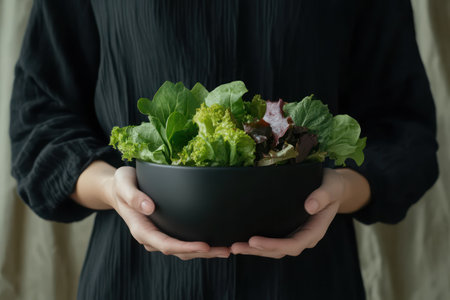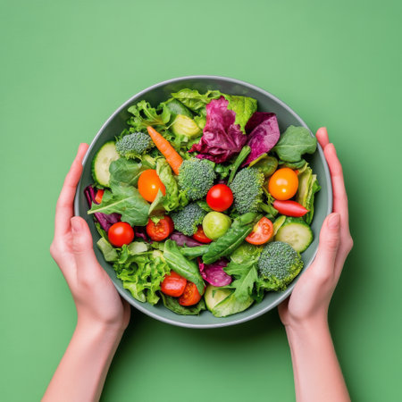 Hands hold gently a large bowl filled with a colorful assortment of fresh greens and vegetables. The vibrant display includes leafy greens, tomatoes, cucumbers, and broccoli.
