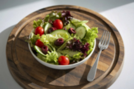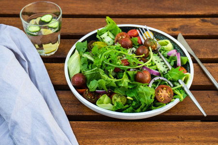Close-up of a fresh summer salad with greens, tomatoes, and cucumbers. Open background for copy