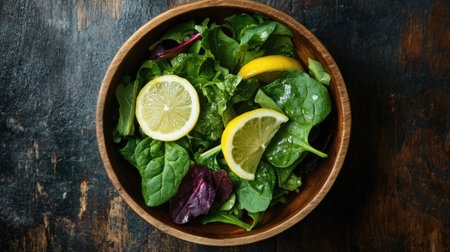 a healthy bowl of fresh leafy vegetables, including spinach, kale, and arugula, served with a light lemon vinaigrette.