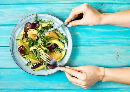 Vegan grapefruit, avocado and arugula salad on blue wooden background. Female hands hold knife and fork. Top view