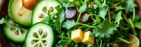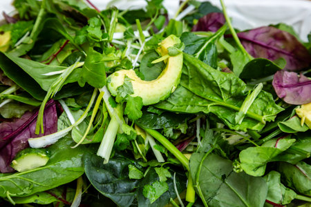 Salad of avocado and vegetables mixed greens lettuce leaves ready to eat.
