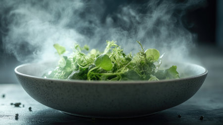 A futuristic bowl filled with a vibrant mix of next-gen greens and seaweed emits a gentle mist. Soft side lighting enhances the experimental fine dining experience, highlighting the molecular garnish.