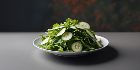 AI Generated. Top view of a vibrant green salad with varied leafy greens arranged neatly on a round white plate on a light background with ample space for text