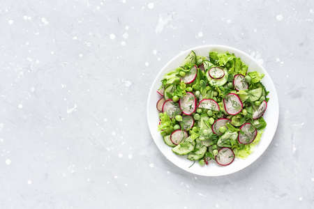 Fresh salad of cucumbers, radishes, green peas and herbs in white bowl. Healthy eating. Top view.