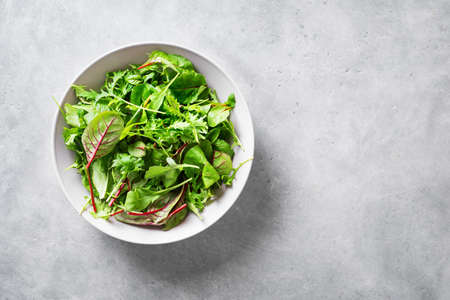 Healthy green salad, fresh organic leaves mix salad with arugula, swiss chard and lettuce, light gray background, top view, copy space.