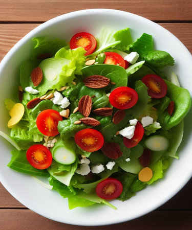 An AI generated illustration of a bowl of freshly prepared salad, full of a variety of vegetables