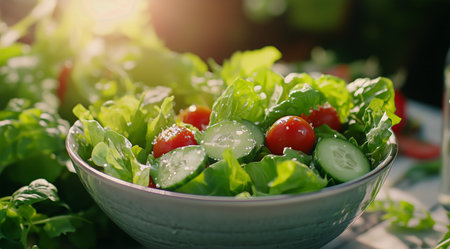 A vibrant bowl of salad filled with ripe tomatoes and crisp cucumbers rests on a wooden table in a sunlit garden. The surrounding greenery adds freshness to the scene.