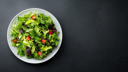 A vibrant and fresh green salad featuring mixed greens and juicy tomato chunks, presented elegantly on a dark textured background. Ideal for health-focused lifestyles.