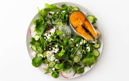 Delicious light salad with cucumbers and arugula, feta and microgreens, radishes and dill, fried salmon