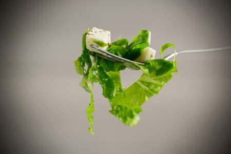 fresh green lettuce salad with mozzarella and herbs on a fork, on a wooden table