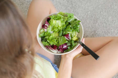 Woman holding a bowl of fresh vegetable salad. Healthy food concept.