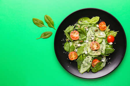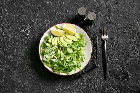 Top view of black plate with vegan salad made from green leaves and vegetables