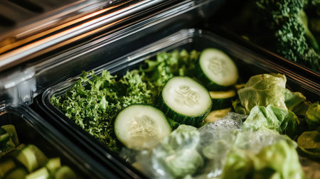 A close-up view of fresh green vegetables in a storage container featuring sliced cucumbers and leafy greens, ideal for promoting healthy cooking and meal preparation ideas.
