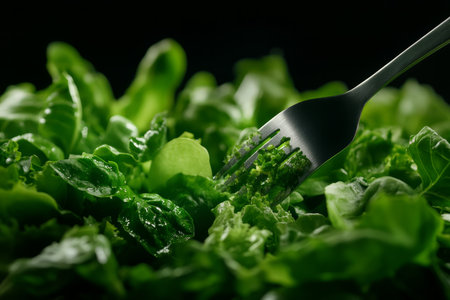 Freshly harvested greens glisten as a compostable fork gently presses into the crunchy leaves, showcasing nature's bounty. Soft, natural tones create a serene atmosphere that enhances the experience.