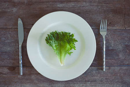 Letucce salad leaves on wooden background. Healthy food illustration. Salad ingridient on the plate.