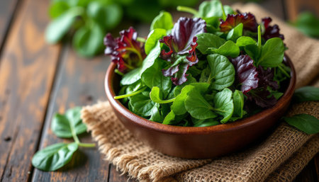 A beautifully arranged bowl of fresh salad greens, featuring rich green and deep purple leaves, rests on a textured burlap cloth. This image captures the essence of healthy eating, showcasing the vibrant colors and natural textures of the greens, perfect for a wholesome meal.