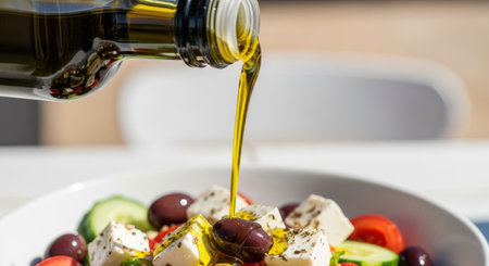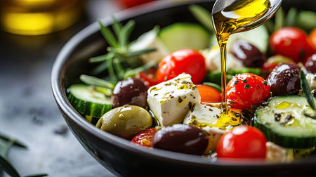 A close-up shot captures olive oil pouring over a vibrant Greek salad. The composition highlights the fresh ingredients: olives, feta, tomatoes, and cucumbers.