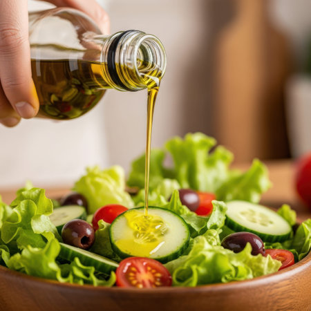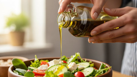 Hands pouring golden olive oil from a glass bottle onto a fresh vegetable salad in a wooden bowl. The healthy meal includes greens, tomatoes, cucumbers, and onions, emphasizing nutrition and clean eating.