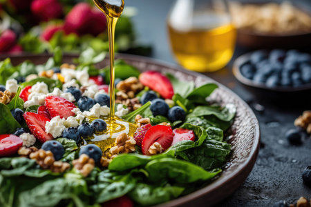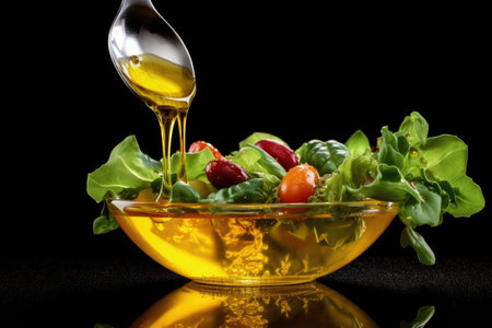 olive oil dripping from a spoon onto a salad, created with generative ai