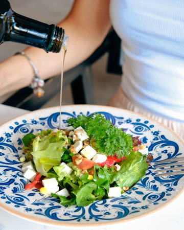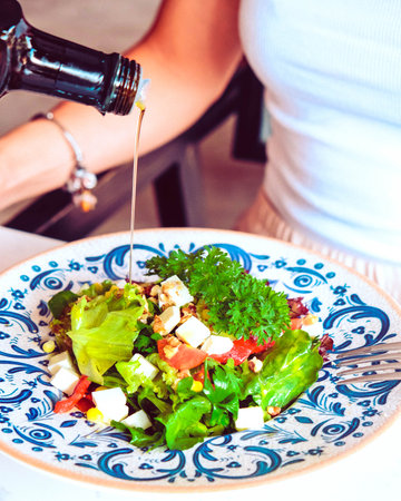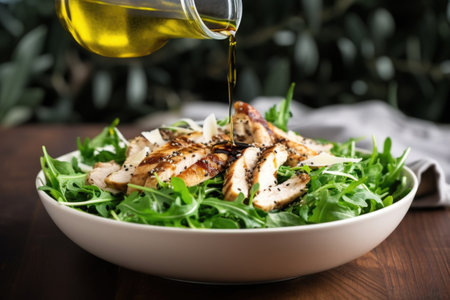 drizzling olive oil and balsamic vinegar on a salad, created with generative ai